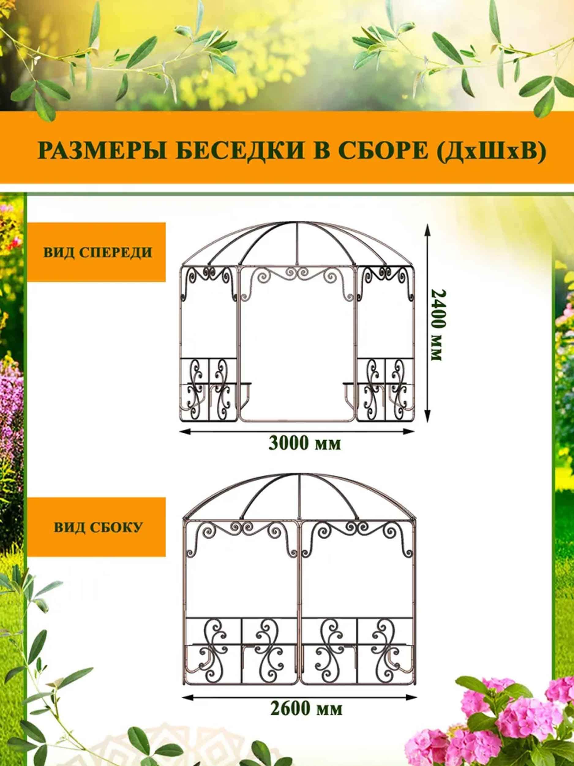 Размеры беседки в сборе: длина - 3 метра, ширина - 2,6 метра, высота - 2,4 метра.