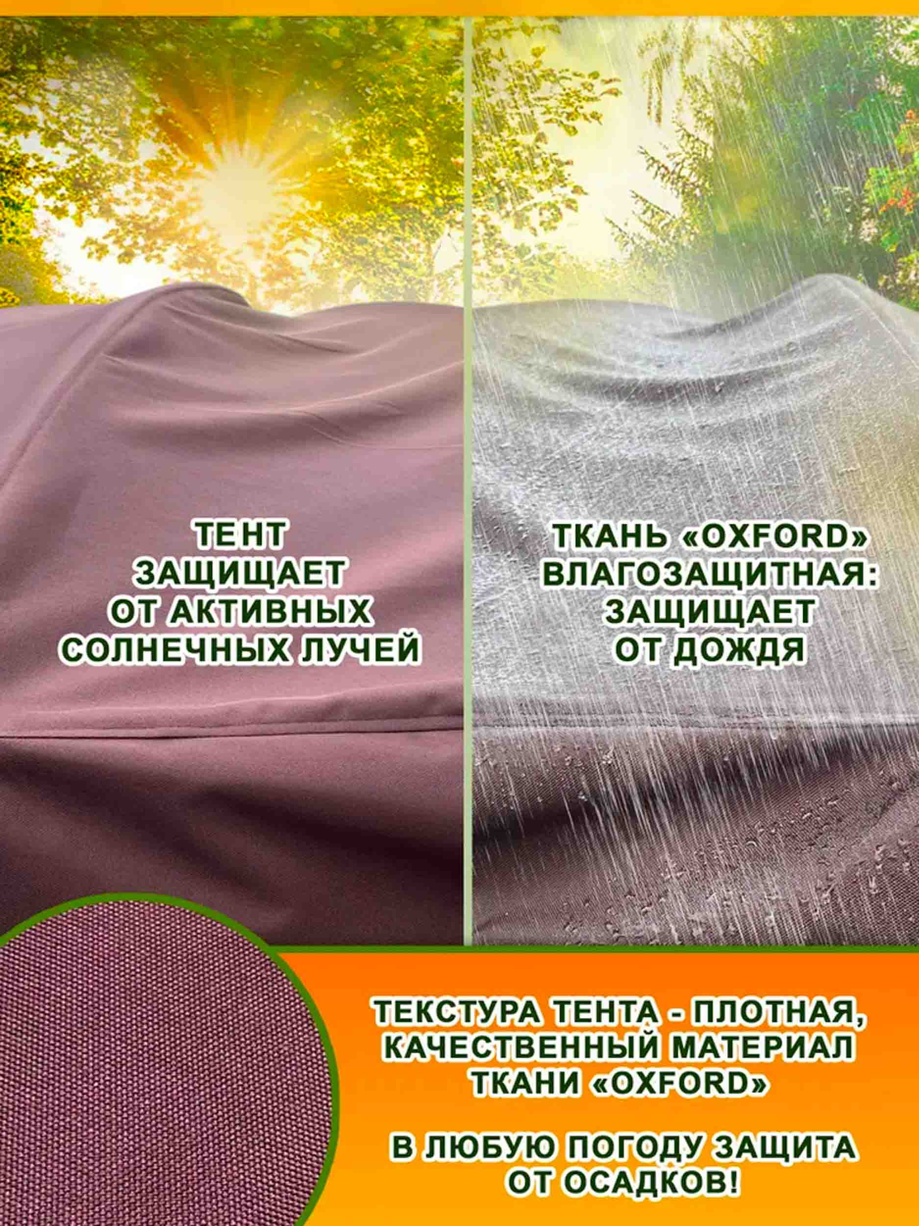 Цвет тента – коричневый. Тент является защитой от дождя и летнего палящего солнца.