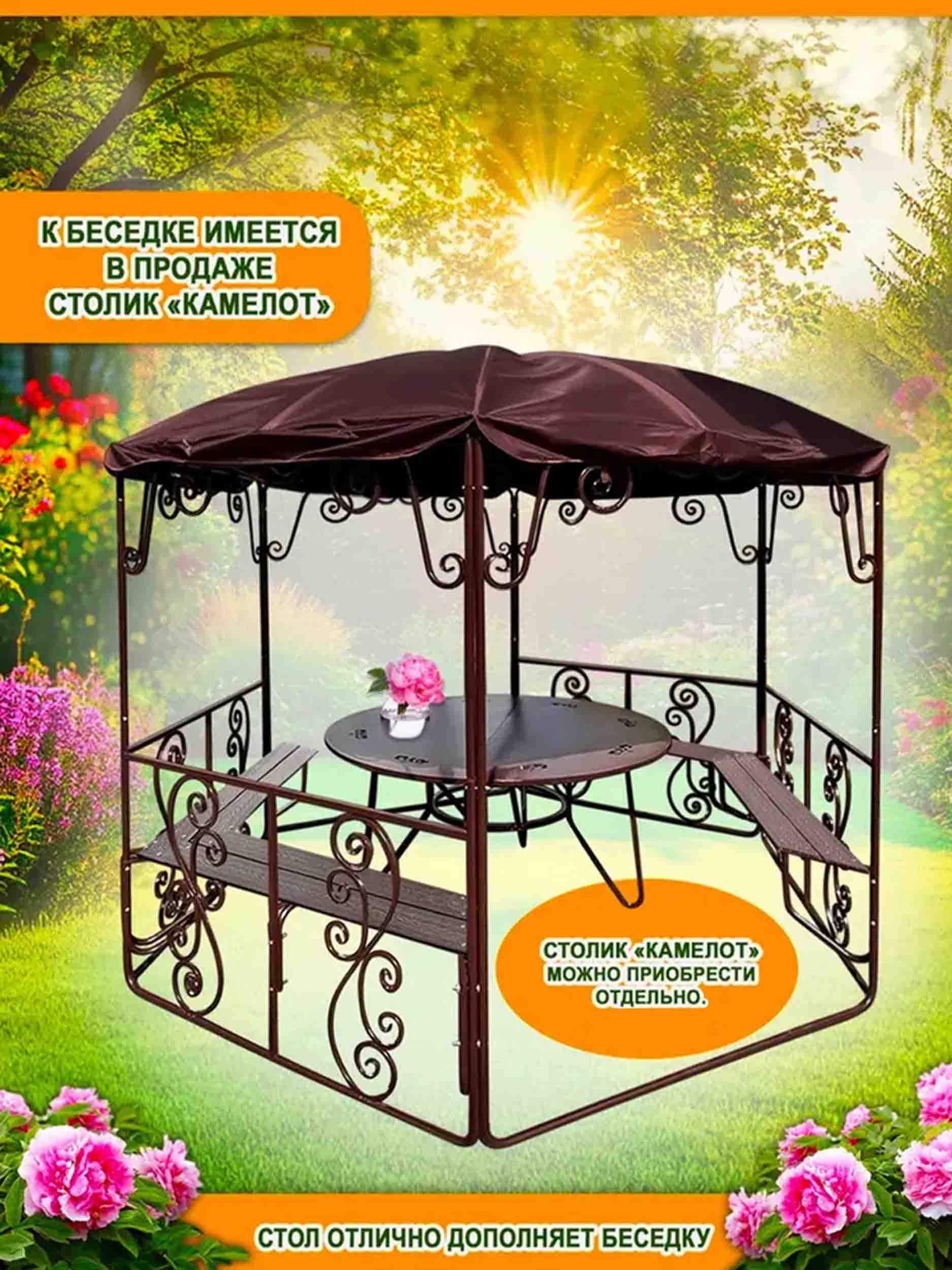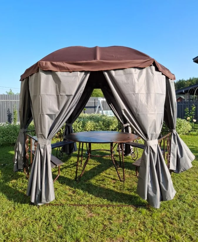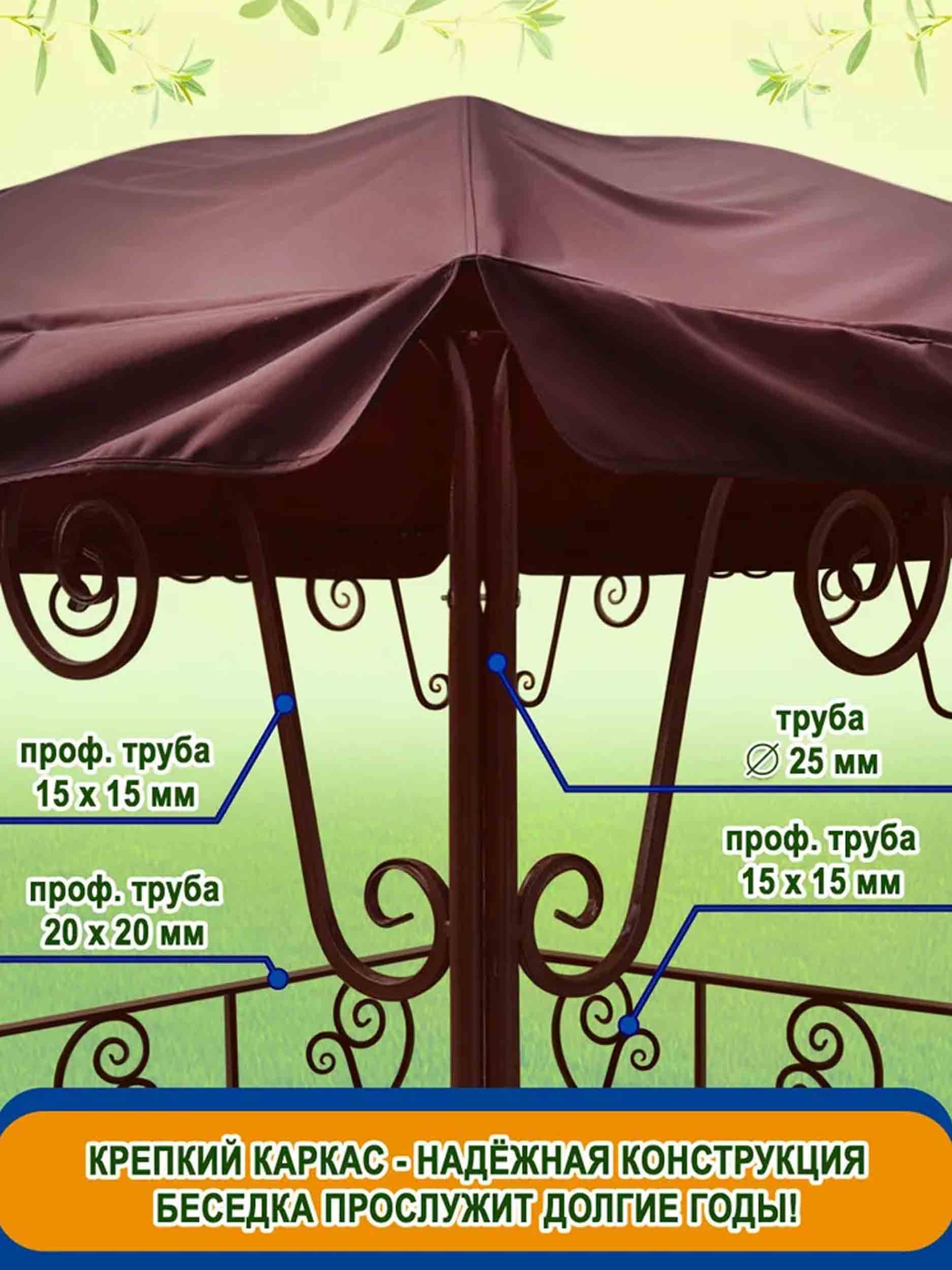 Эта беседка изготовлена из металла, что обеспечивает долговечность изделия. Позволит Вам комфортно разместиться внутри и наслаждаться природой вокруг!