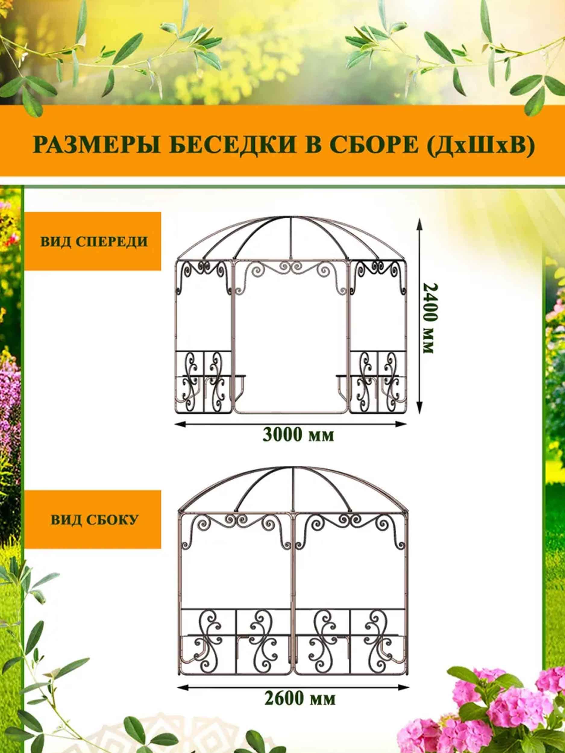 Размеры беседки в сборе: длина - 3 метра, ширина - 2,6 метра, высота - 2,4 метра.