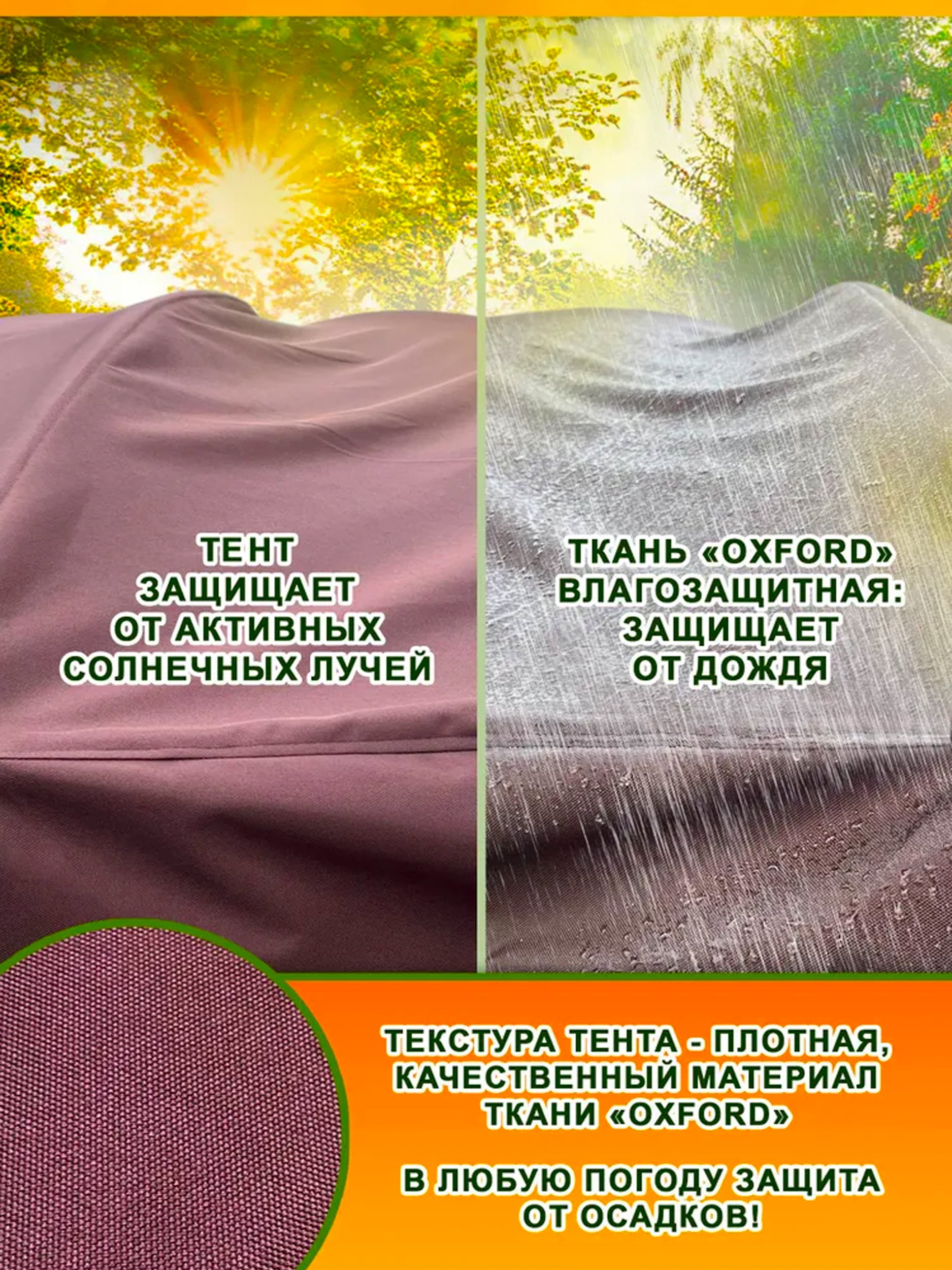 Цвет тента – коричневый. Тент является защитой от дождя и летнего палящего солнца.