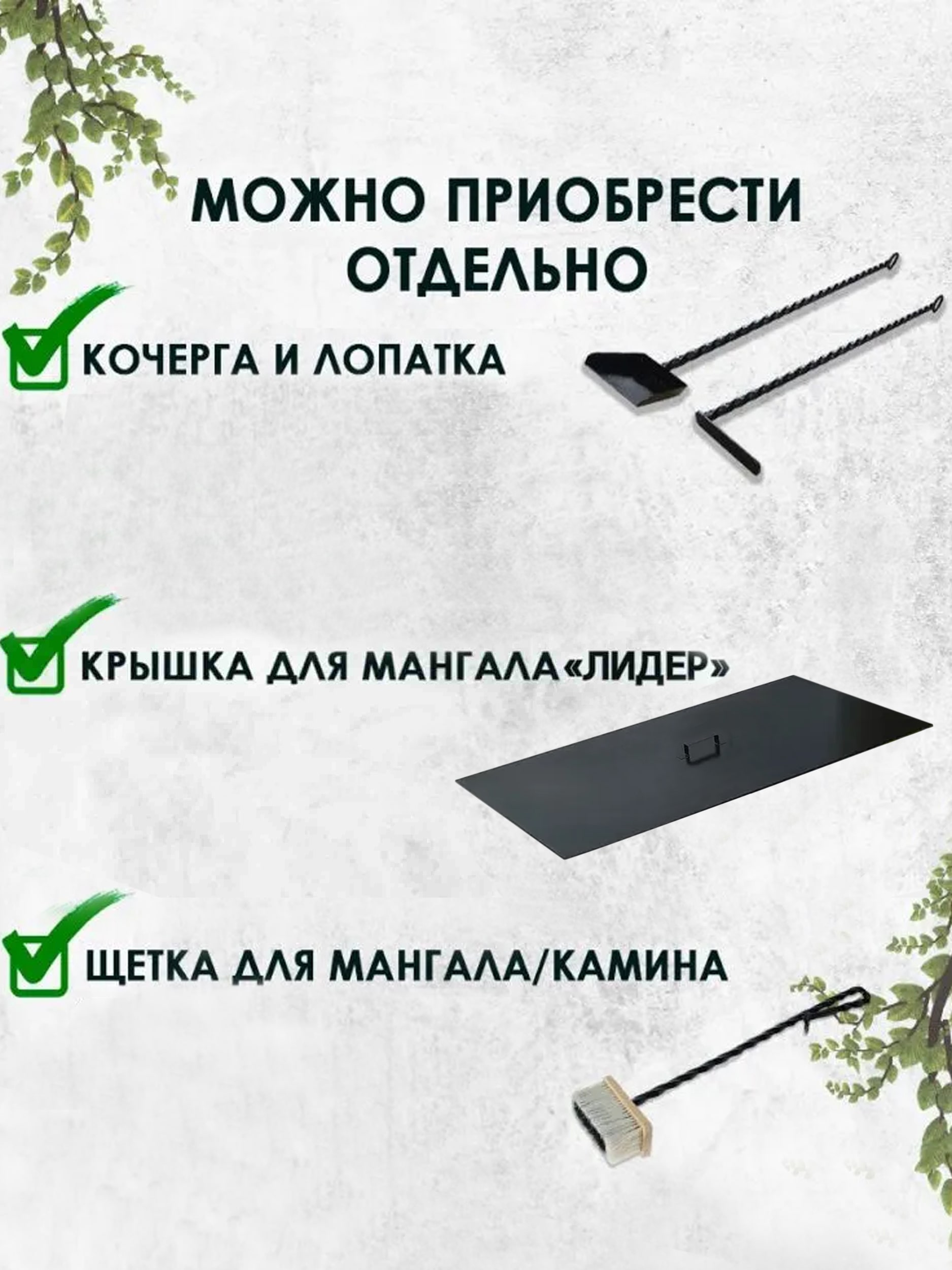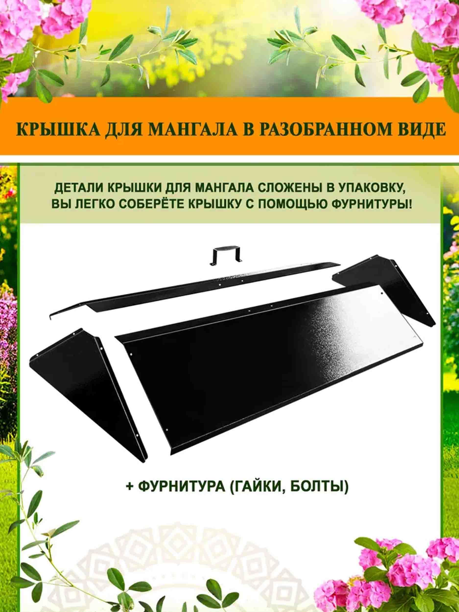 Прочная металлическая крышка для мангала не поддается деформации и не позволяет выгореть от высоких температур. Крышка защищает от искр, а также не позволяет пыли и грязи попадать на пищу во время приготовления.