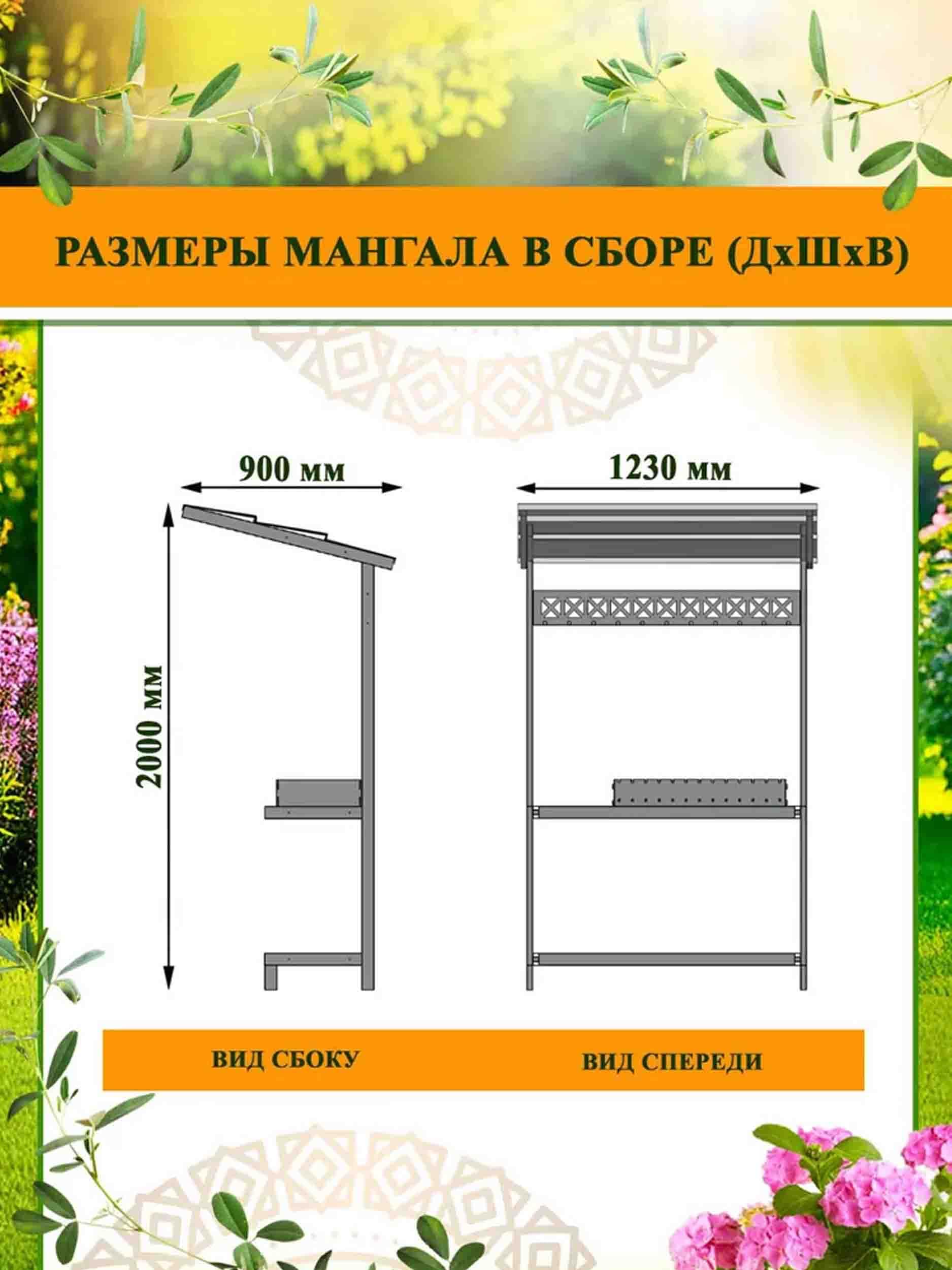 Общая длина мангала - 1230 мм, общая ширина мангала - 900 мм, высота мангала - 2000 мм.