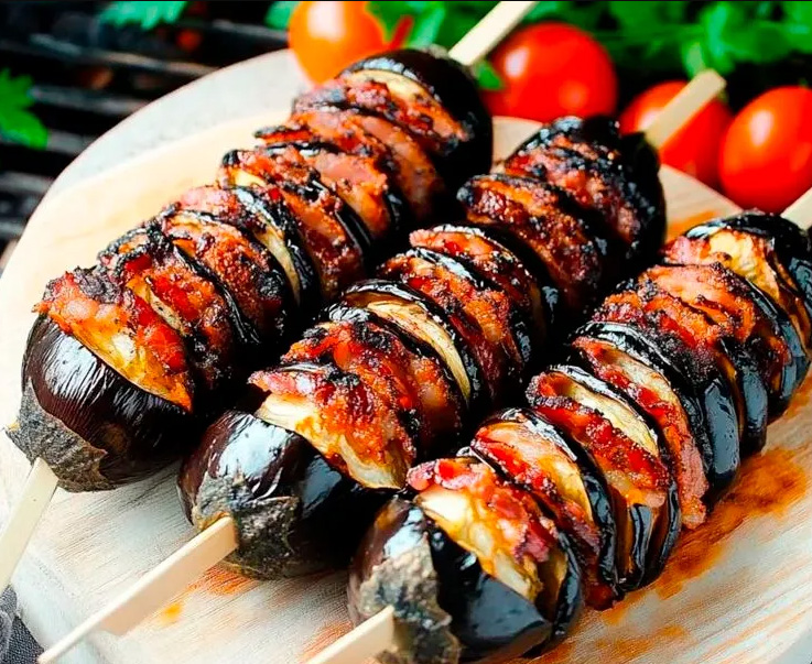 Баклажан, запеченный с беконом на мангале.