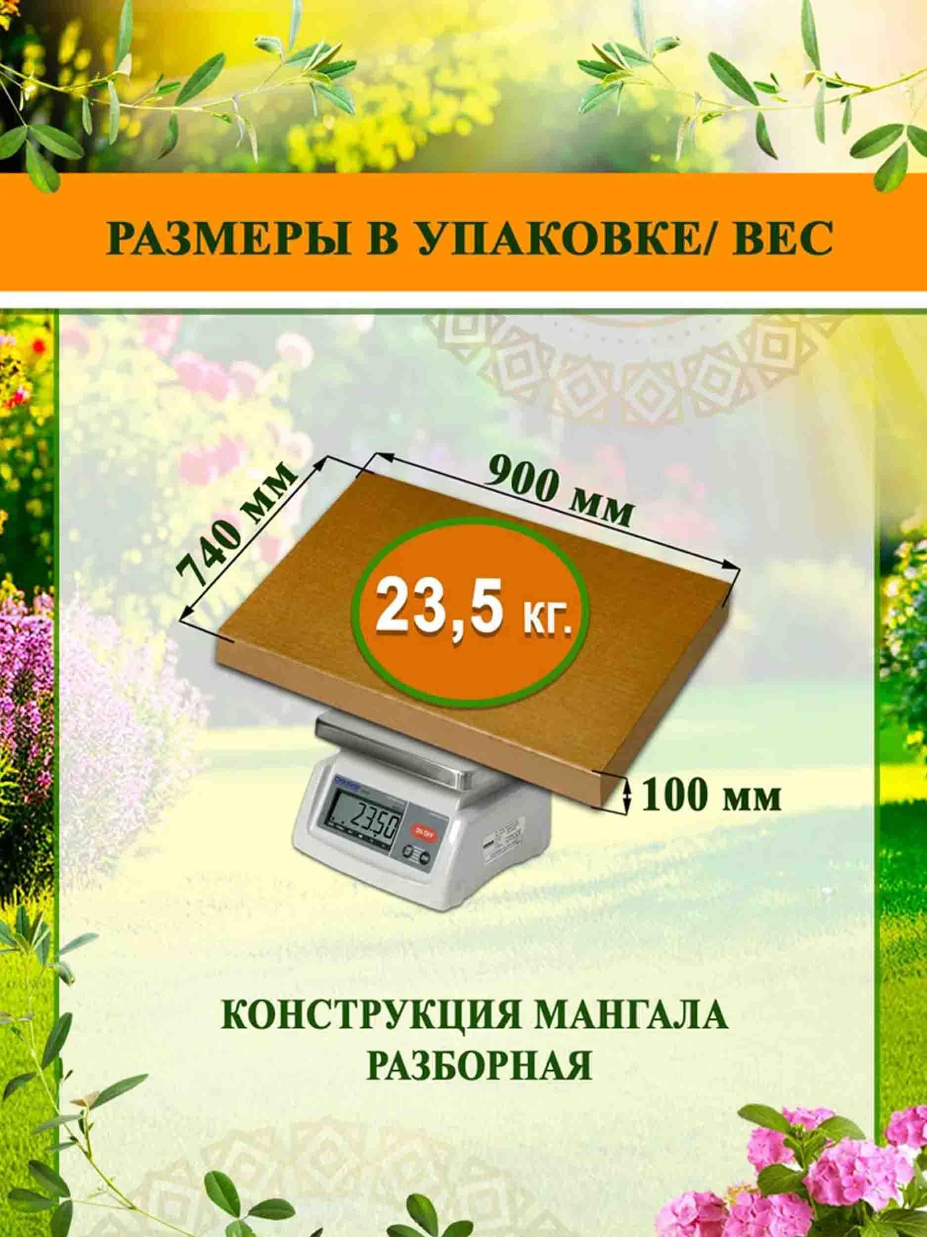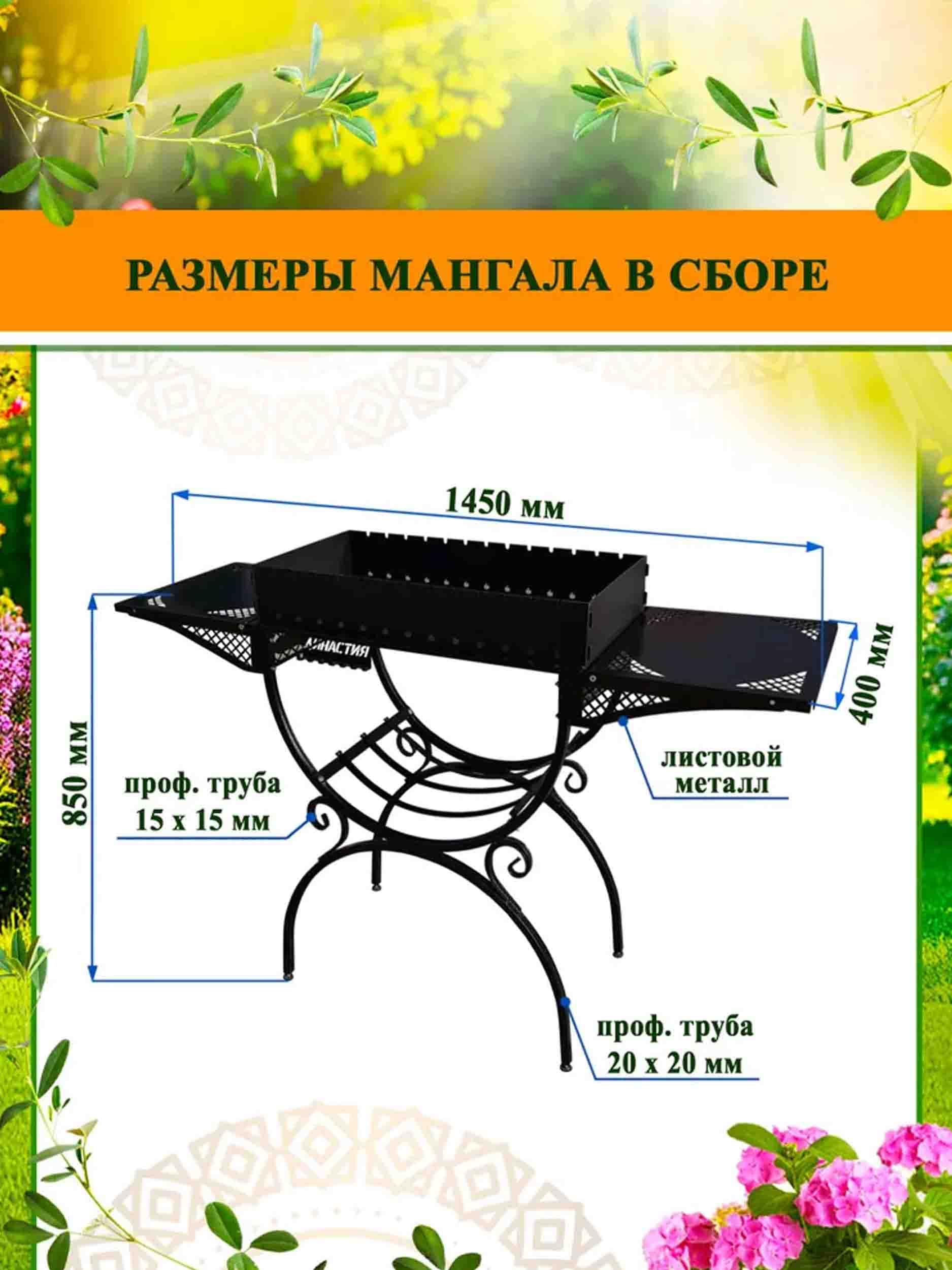 Размеры в сборе: длина мангала - 1450 мм, ширина мангала - 400 мм, высота мангала (без учета мангального короба) - 850 мм.