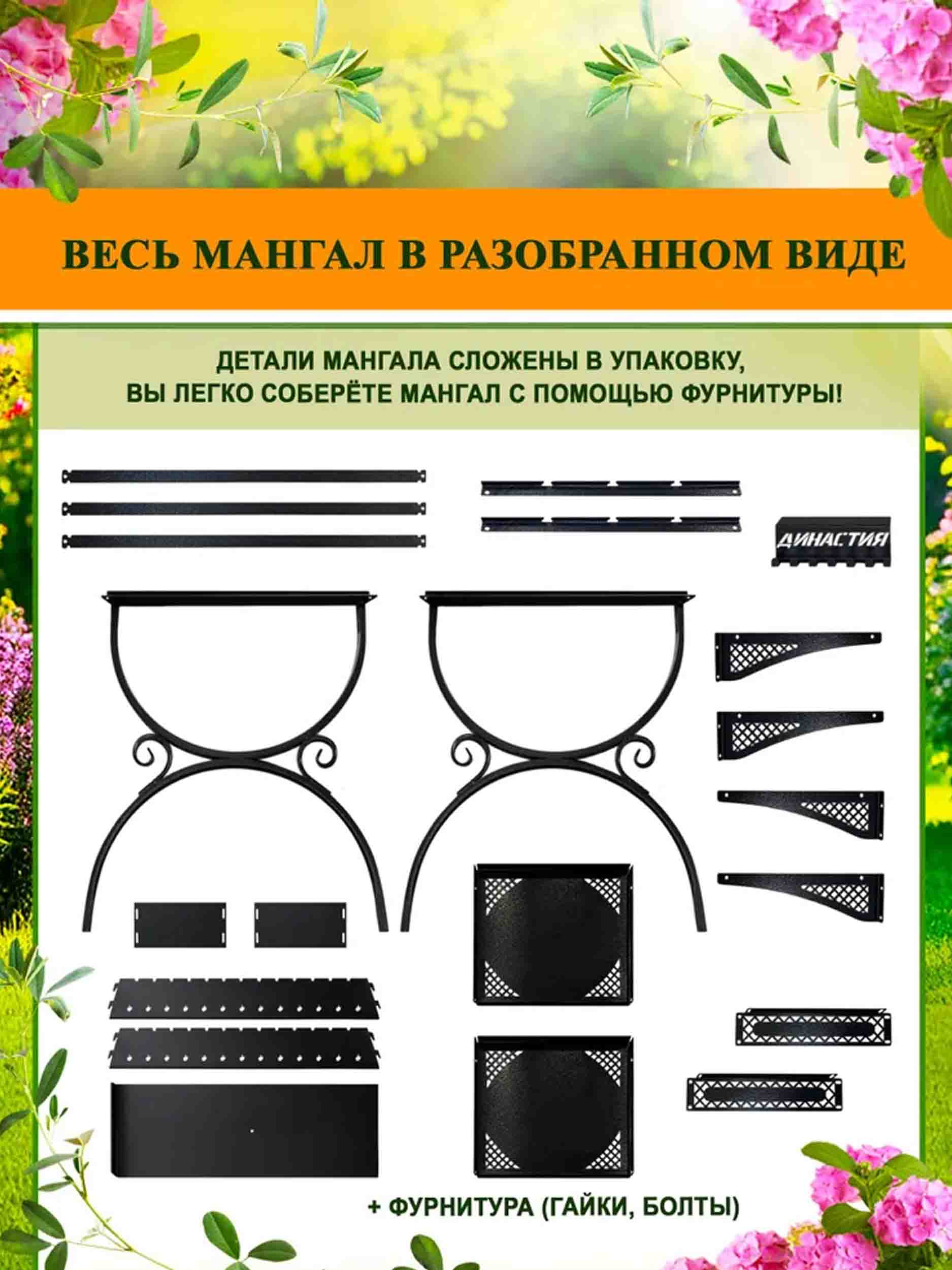 Сборка мангала не займет много времени и сил, так как мы предусмотрели все необходимые элементы для легкой сборки.