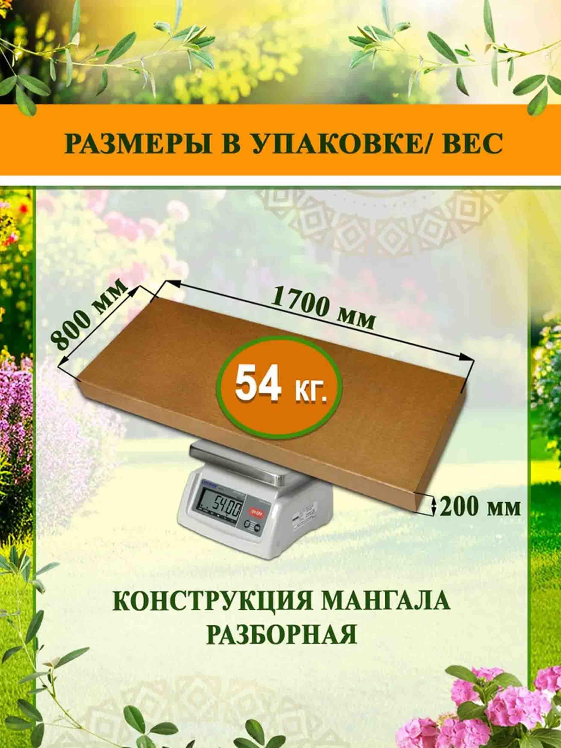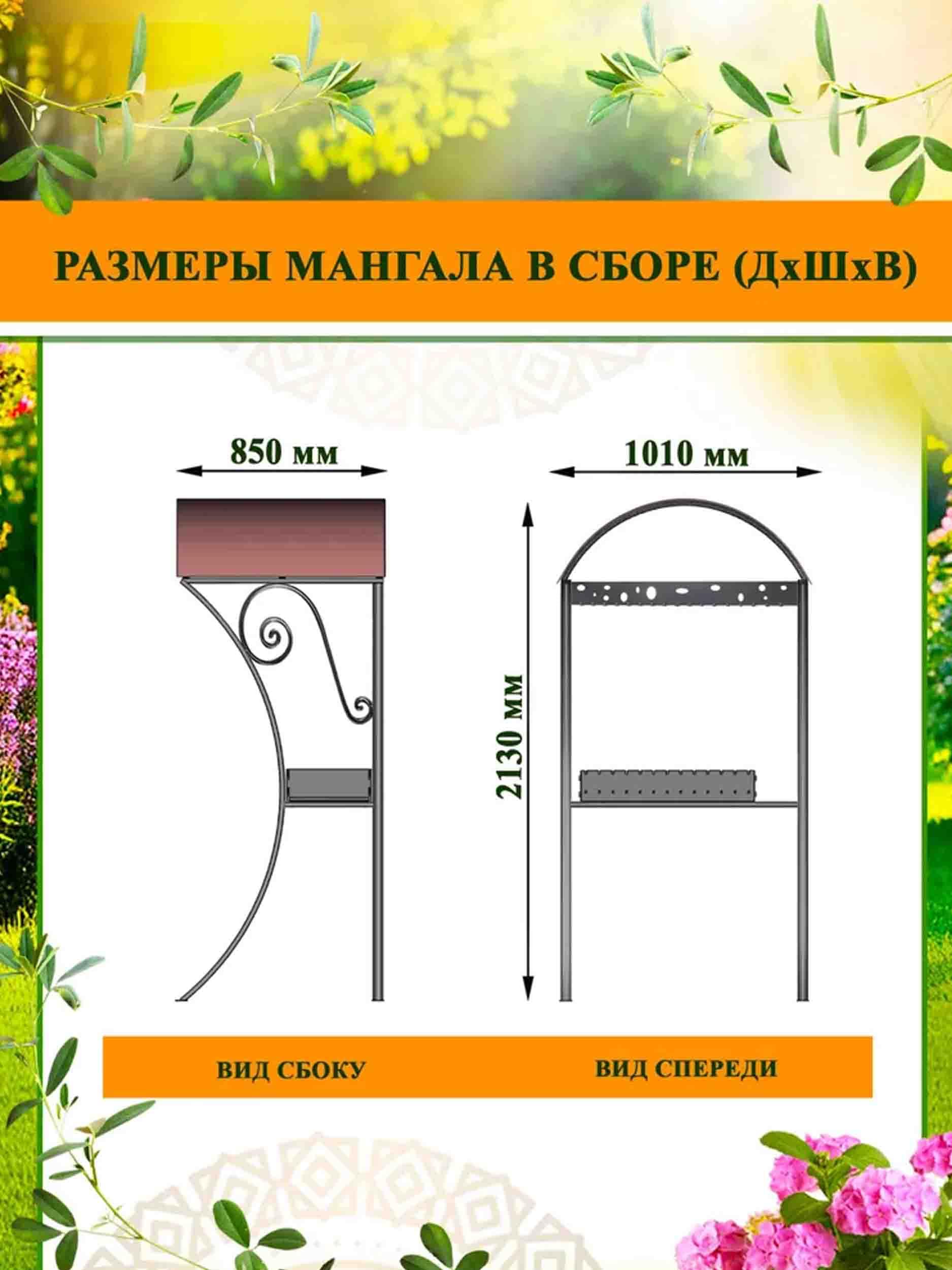 Мангал имеет длину - 1010 мм, ширину - 850 мм, высоту - 2130 мм.