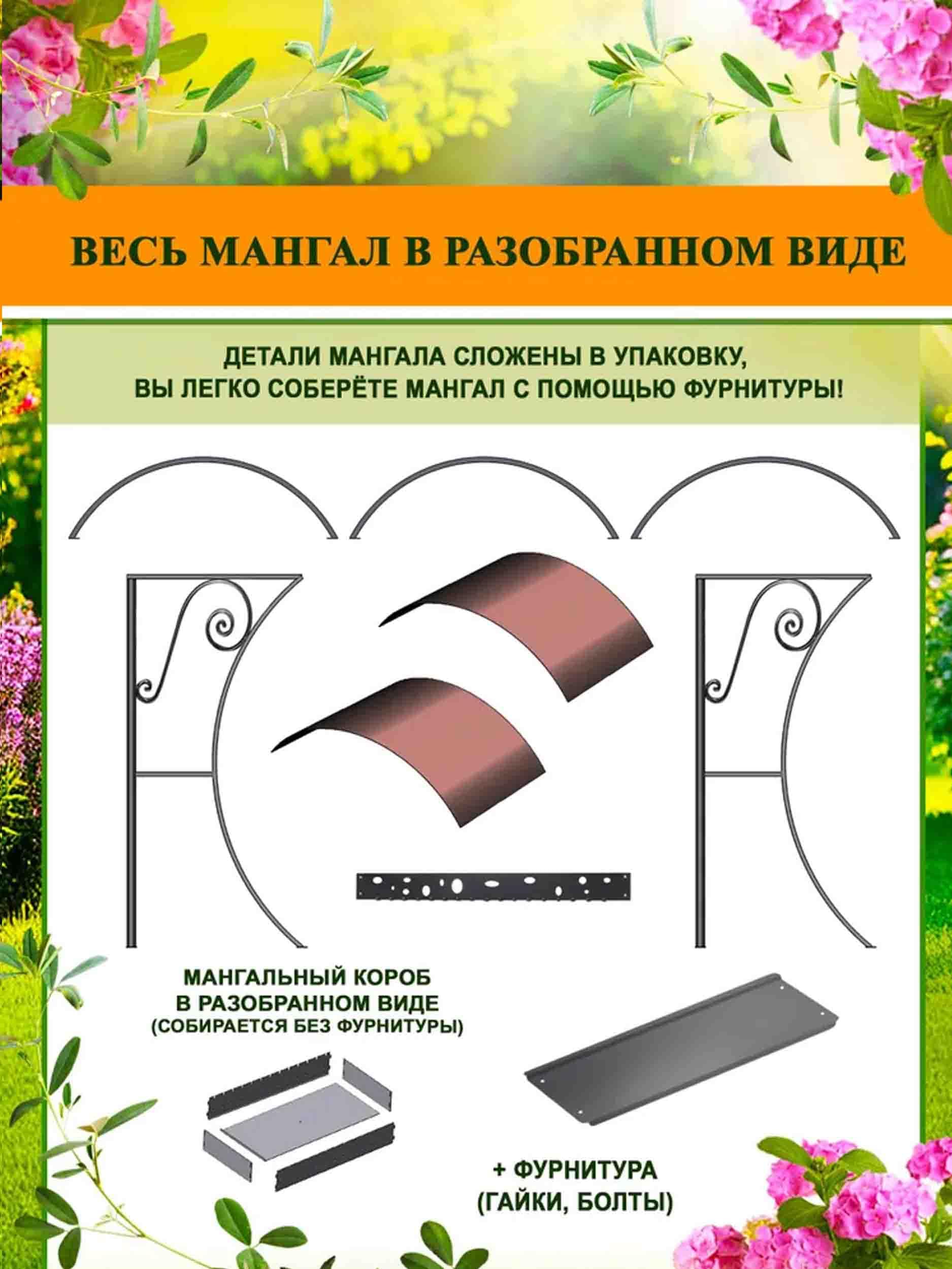 Поставляется в разобранном виде. Сборка мангала не займет много времени и сил, так как мы предусмотрели все необходимые элементы для легкой сборки.