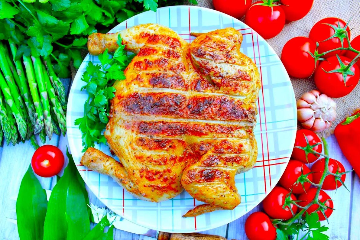 Готовую курицу подавайте сразу же с пылу с жару в горячем виде со свежими или запечёнными овощами, соусами и салатами.