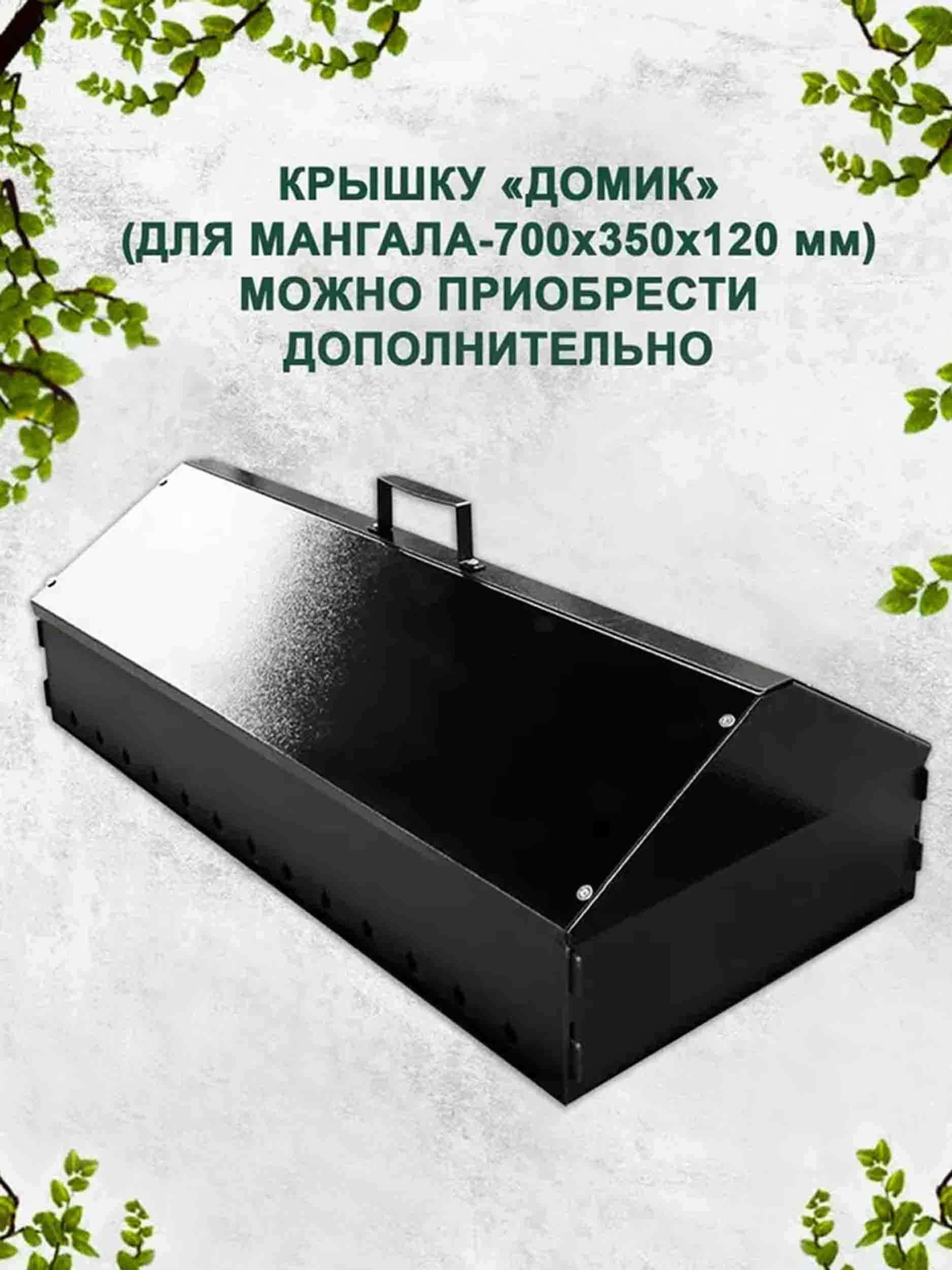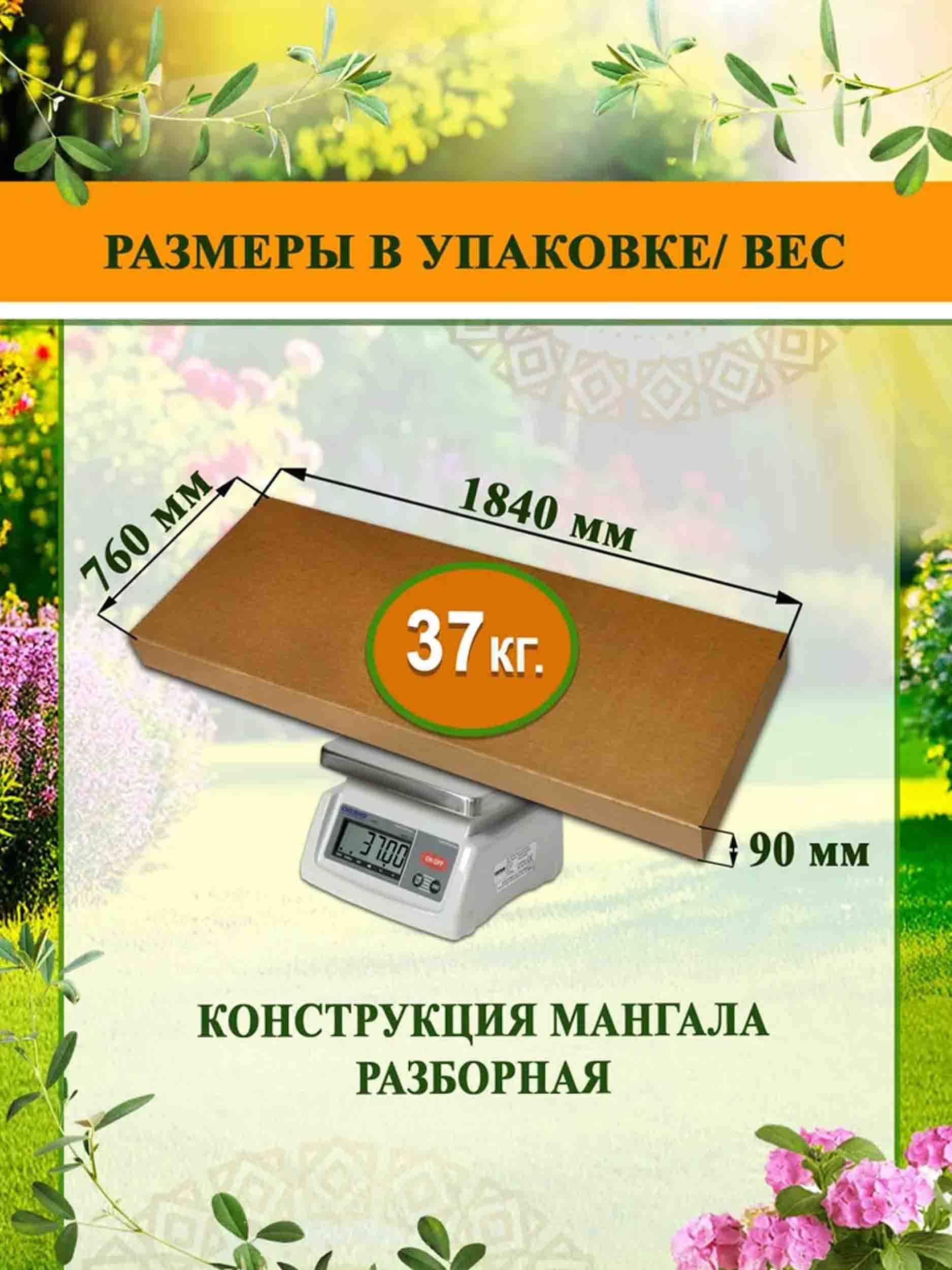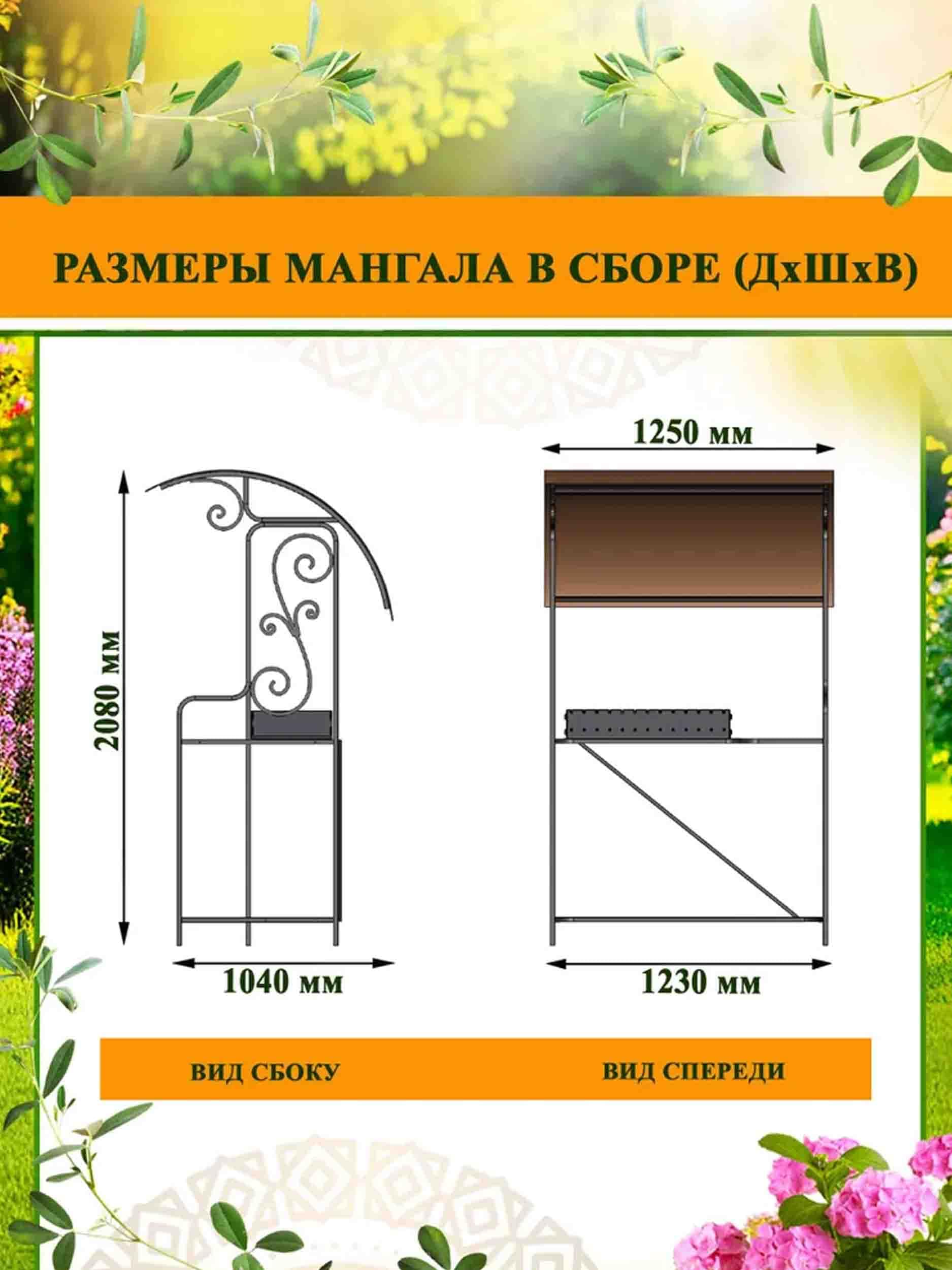 Размеры в сборе: общая длина мангала - 1250 мм, длина мангала по нижней части корпуса - 1230 мм, общая ширина мангала - 1040 мм, высота мангала - 2080 мм.