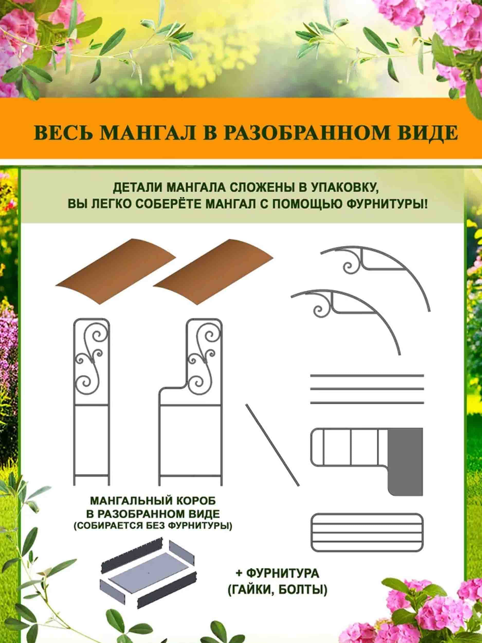 Сборка мангала не займет много времени и сил, так как мы предусмотрели все необходимые элементы для легкой сборки.