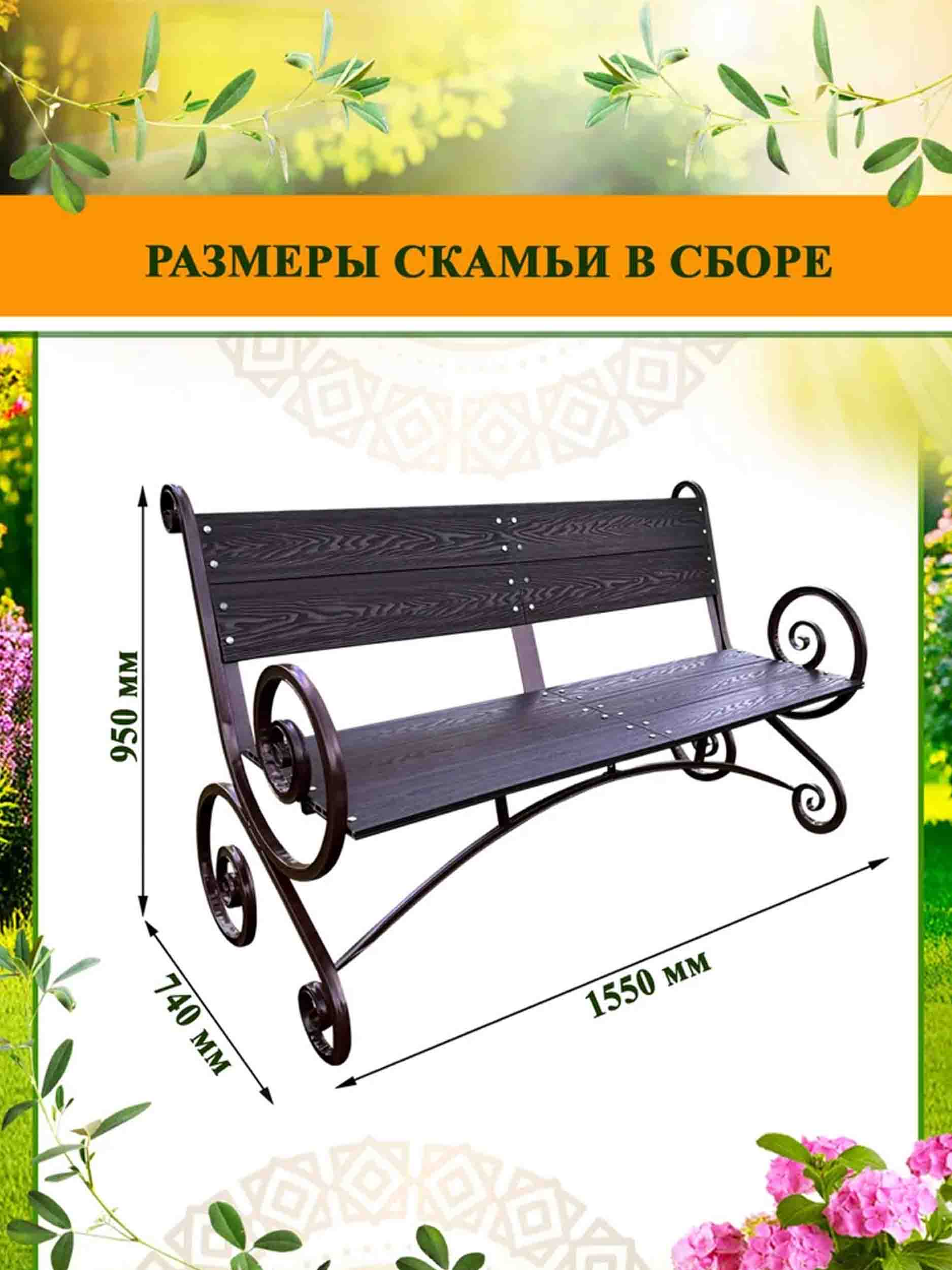 Скамья имеет ширину - 155 см, высоту - 95 см и глубину - 74 см.