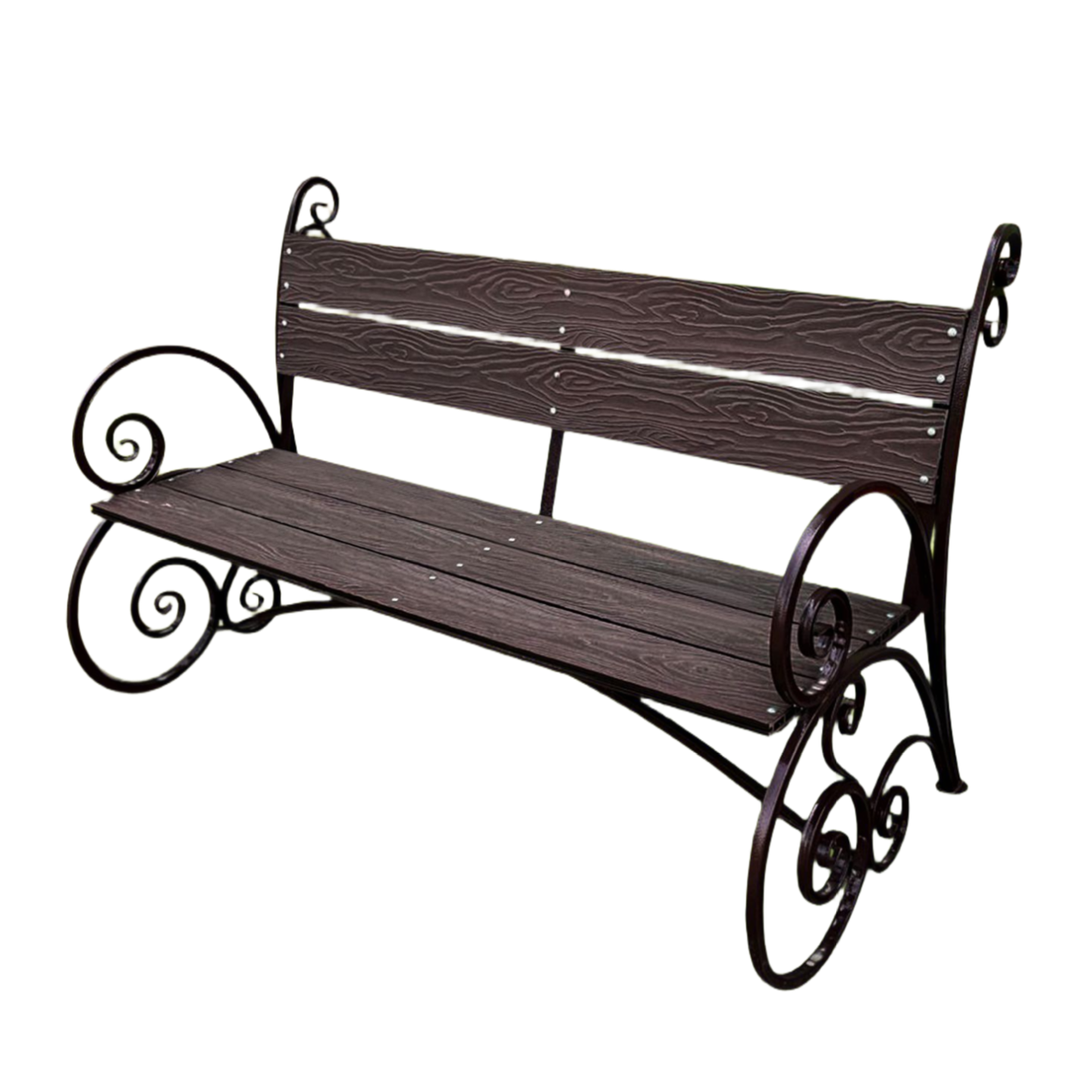Эта скамья изготовлена из металла и имеет прочное сиденье из ДПК (Древесно-полимерного композита), которое обеспечивает комфортное положение тела при длительном пребывании на ней. Материал сидений долговечен, устойчив к осадкам и не требует специального ухода.