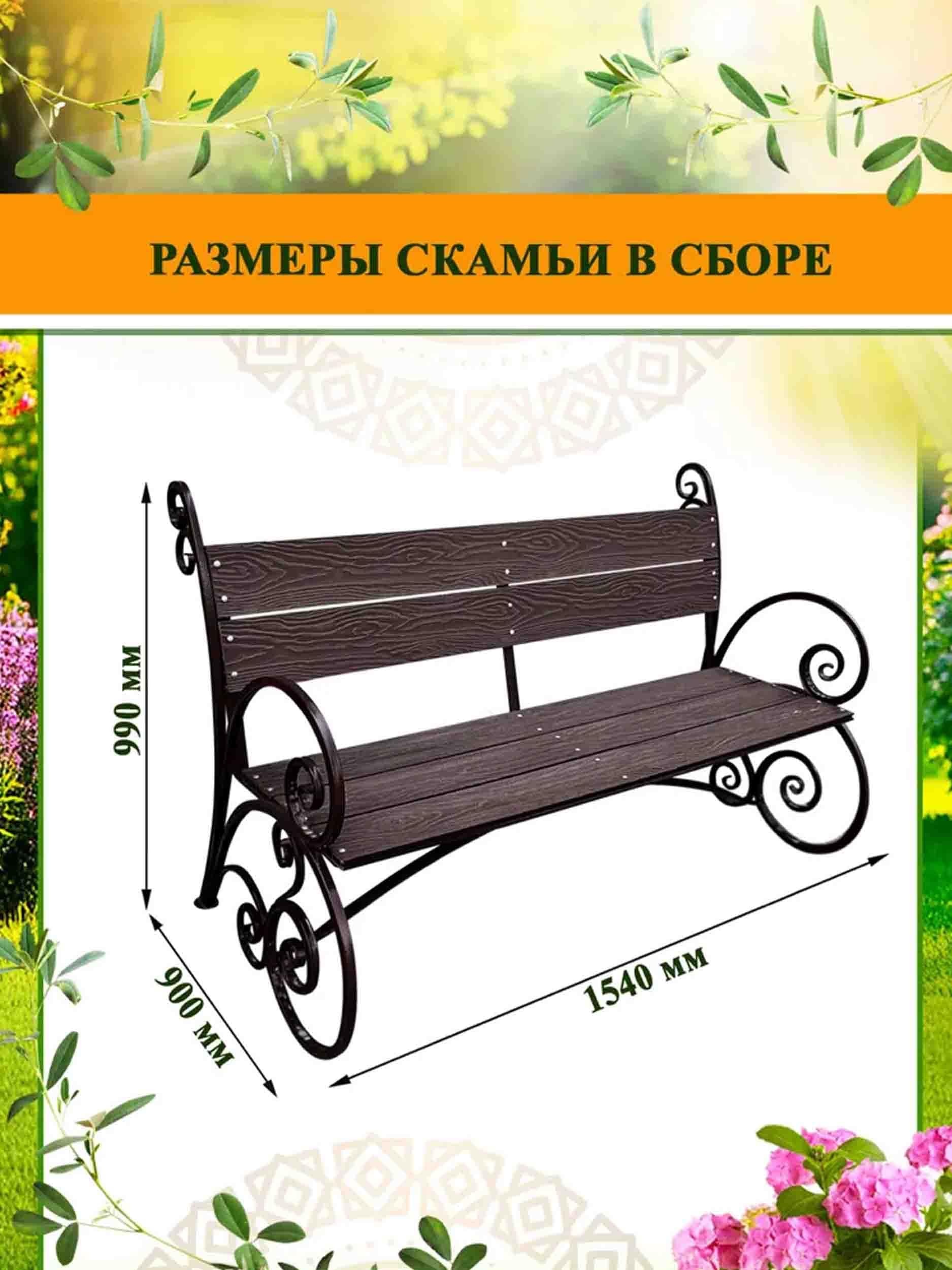 Скамья имеет ширину - 154 см, высоту - 99 см и глубину - 90 см.